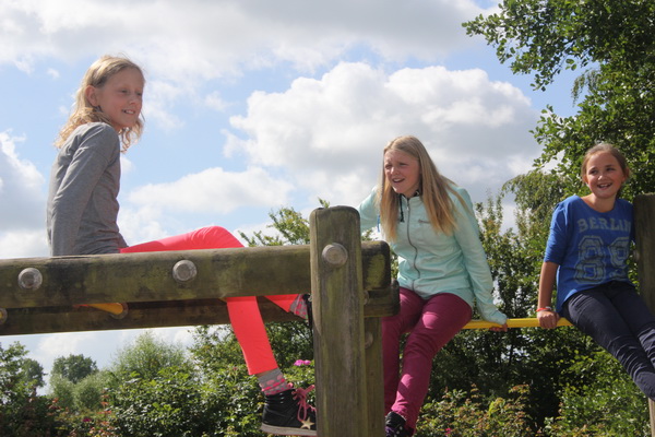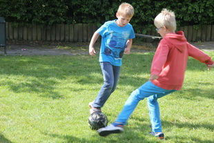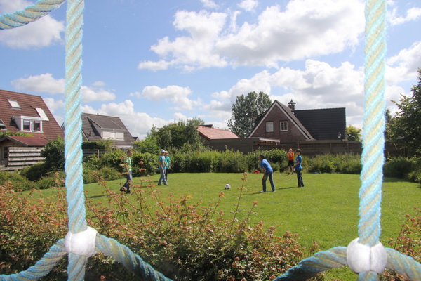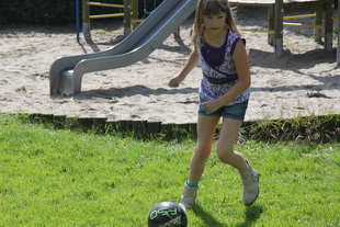 Op het gras wordt veelvuldig gevoetbald. Invloed van het WK? Niet alleen jongens, ook meisjes, zoals Chantal!