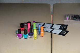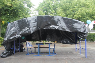 Diverse amusementsmogelijkheden op het plein en achter de school! Hier de nagellakstudio, waarover provisorisch een anti-regendak is gelegd van zwart landbouwplastic. Gezien het lakassortiment lopen er straks heel wat kinderen kleurrijk rond!