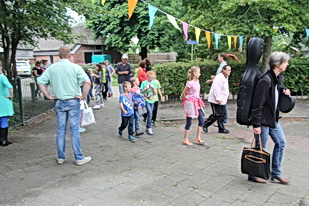 De toeloop van ouders en andere belangstellenden komt enigszins aarzelend op gang. Het wachten is ook op de grote groep kinderen van beide scholen die ’s middags samen naar het Spijkerdorp bij Drachten gingen. De retourbus is iets vertraagd, het is druk op de weg,