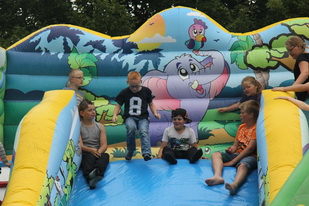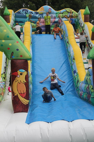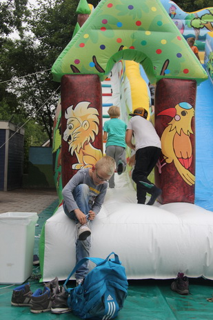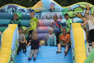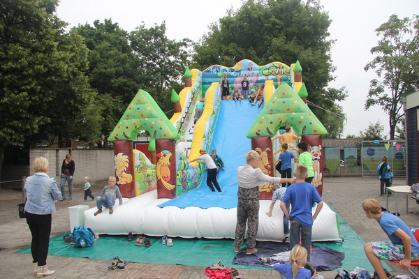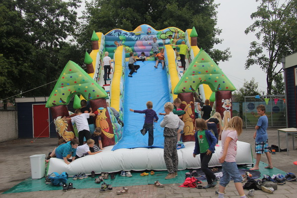 De grootste blikvanger als je het plein betreedt bij ’t Kompas aan het Hamsterpad, vanaf nu Samenwerkingsschool Noordhorn geheten: Het prachtige springkussen, pardon, de kleurrijke glijbaan! Het officiële startsein heeft nog niet geklonken, maar ja, de verleiding is wel erg groot….