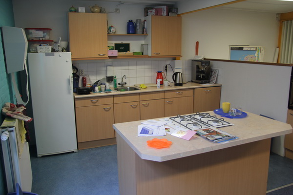 De nog als nieuwe keuken met de kinderkookplek op de voorgrond. De voorziening is denk ik nog geen 10 jaar oud…. Toen ik in 1972 begon in de school aan de Oosterweg, was er eigenlijk geen keuken. Tussen trap naar het kamertje en werkkast een smalle ruimte met een aanrechtblok (2 onderkastjes) en ernaast tegen de buitenmuur aan een tweepits gasstel….