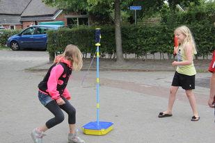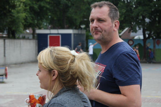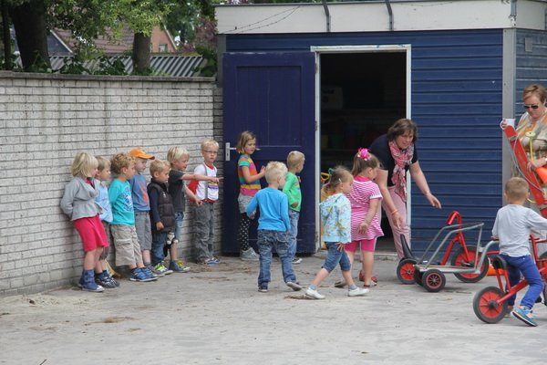 Gelegenheid voor de jongste kinderen om nu hun speeldrang uit te leven op een groter stuk van het plein. Even op je beurt wachten bij het verkrijgen van het gewenste materiaal….