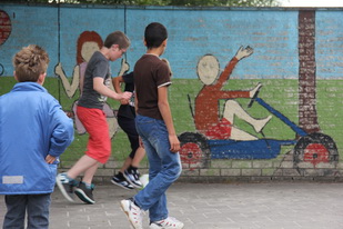 Aan de oostkant bij de muur is een strook waar een balletje kan worden getrapt en dat gebeurt dus ook….