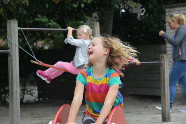 Rond het gebouw aan het Hamsterpad is er veel ruimte voor kinderen en zijn er diverse spelmogelijkheden, zoals hier wordt gedemonstreerd….