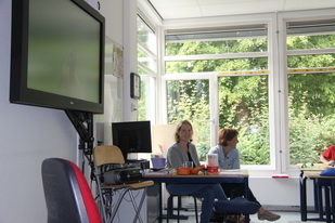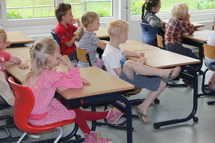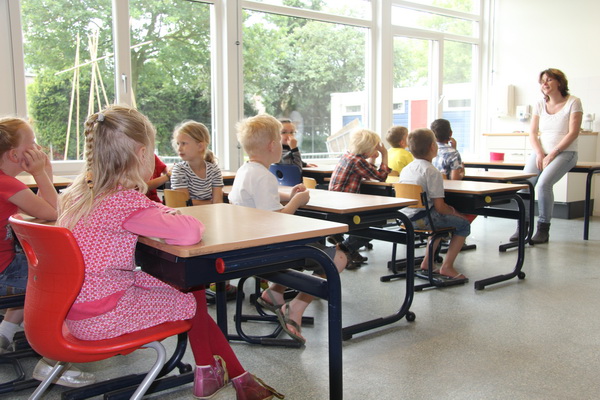 Stil neem ik een kijkje (en kiekjes) binnen in de school. Meteen aan mijn rechterhand na binnenkomst groep 5/6 met juf Judith en juf Wilma. De groep kijkt geconcentreerd naar een videopresentatie. Of heet dat tegenwoordig anders?!