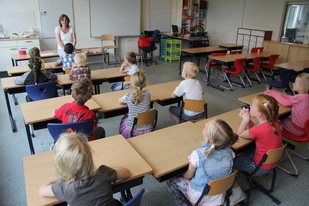 Juf Tiny zit iets verderop met een deel van groep 3/4. Het zal groep 3 zijn, want ze zijn samen druk bezig met het schrijven van het cijfer ‘3’….