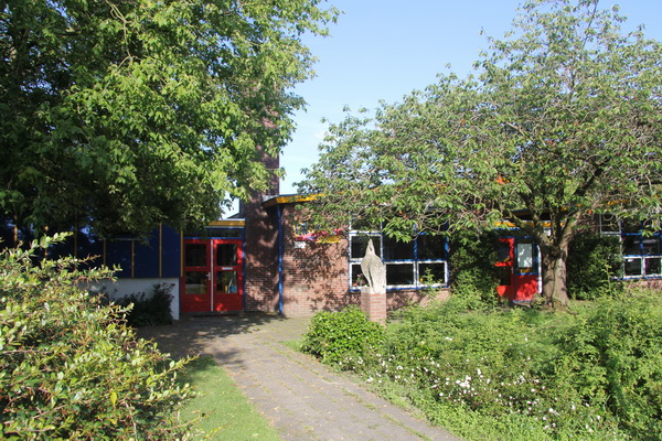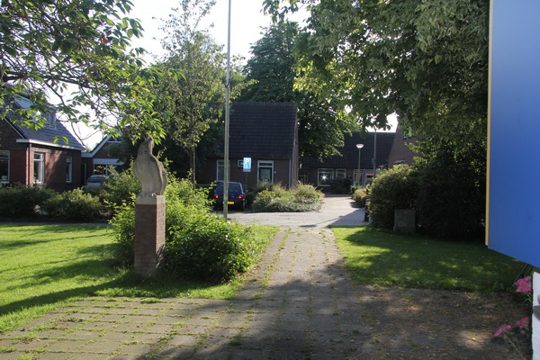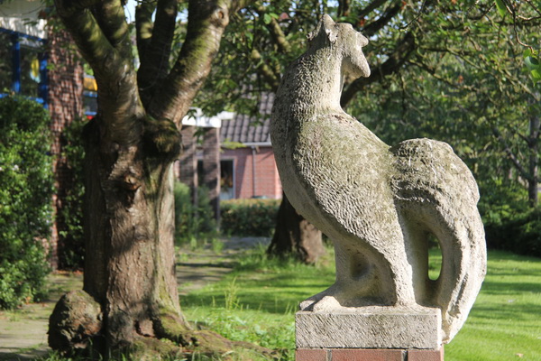 Het beeld van de haan, gemaakt door beeldhouwer Willem Valk. Nee, dit is niet de originele plaats waar de haan zijn plekje kreeg, in 1956, bij de opening van deze nieuwe school als opvolger van het gebouw aan de Langestraat. De haan stond aan de zuidkant, in het perk dat er toen lag. De symboliek van de haan? Denk maar aan het woord “wakker”. (Nee, alle insinuaties richting de Rooie Haan etc. raken kant noch wal…)