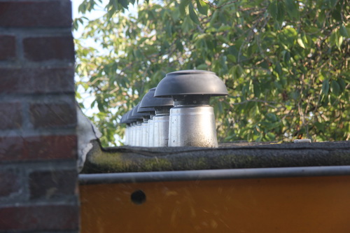 Intussen ben ik de kelders weer ‘ontvlucht’, heb mijn toevlucht gezocht in ‘het kamertje’, waarin ik ook zovele uurtjes heb doorgebracht. Door een van de ramen zie ik een rij pijpjes op het dak van dichtstbijzijnde lokaal, broodnodige ontluchting om vochtschade te beperken?!