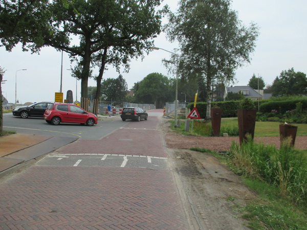 Langestraat Zuid, nadering tunnelgebied. Links de inrit van huize Kruizinga…. Nu de tunnel grotendeels is ‘weggewerkt’, valt het des te meer op wat voor bres de wegverlegging aan deze zuidkant van Noordhorn geslagen heeft… Gelukkig wordt het geheel nog aangekleed, want de huidige situatie maakt pijnlijk duidelijk hoe het woongebied tot aan het kanaal is losgekoppeld van het dorp.