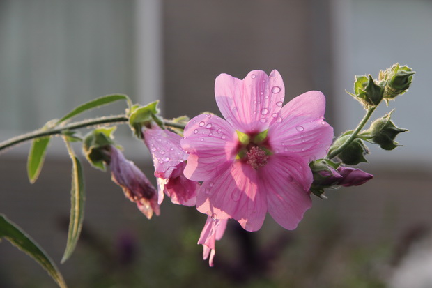 Foto van vanmorgen in de eigen achtertuin, beregende lavatera… (Hoop dat ik de naam goed schrijf…)