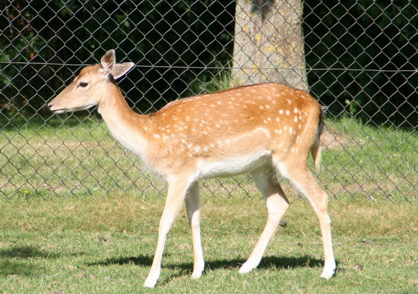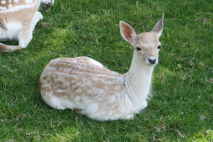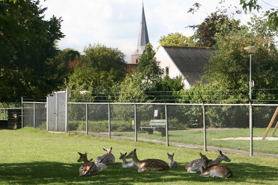 Zomerochtend in de hertenkamp. De andere damherten hebben een plekje in de schaduw gekozen, maar deze hinde wil wel even in het zonnetje staan….