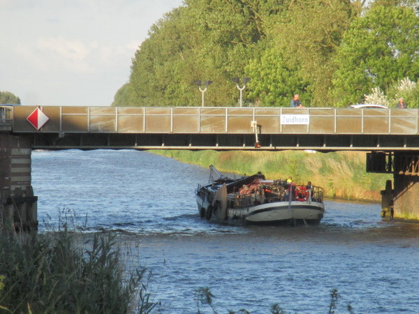 De “Adriana” uit Zwolle gaat oostwaarts, onder de tafelbrug door.