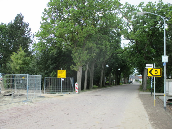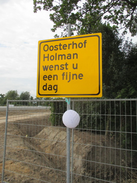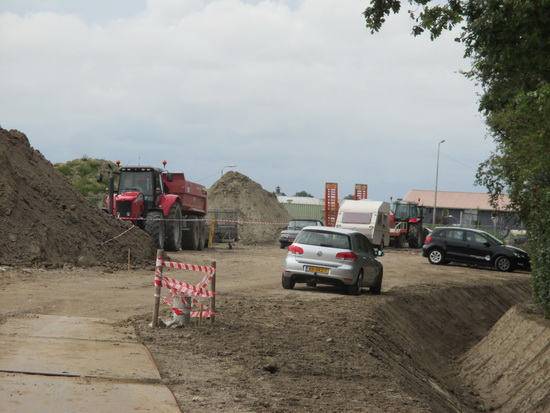 Aha, verheldering: De chauffeurs wordt naar het open hek verwezen, naar het brede pad dat een dag van te voren naarstig is gerealiseerd! Breed genoeg, hier kan zelfs een enigszins aangeschoten feestvierder voor- en achteruit! (Alhoewel, misschien hadden ze toch met het uitgraven van de sloot beter een weekend kunnen wachten…)