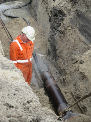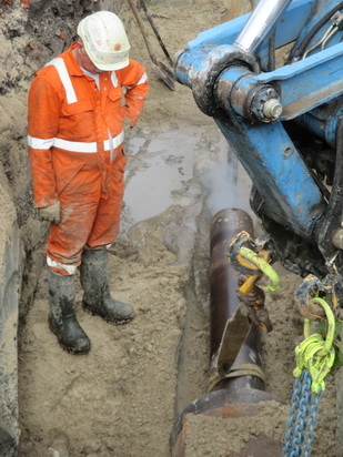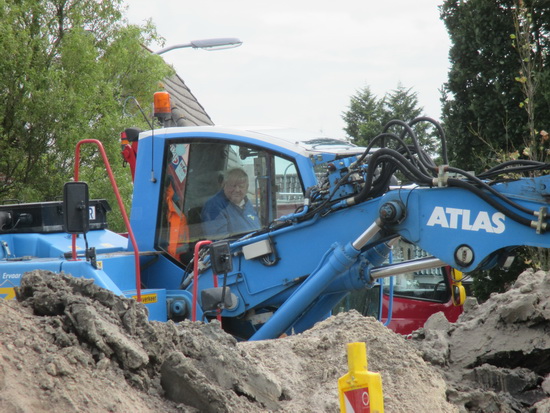 Langzaam maar zeker verdwijnt de kleinere buis schoksgewijs in de grote…. De toezichthouder houdt twee ogen in ’t zeil. Buurtbewoner Buist vraagt of ik ook het geluid erbij lever…. Nee, filmen doe ik niet, is een vaardigheidsbrug te ver…..