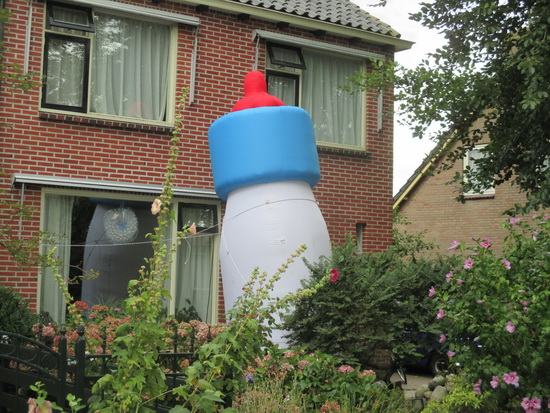 Bij Jan Ellens in de Norritsstraat is een enorme zuigfles in de voortuin geïnstalleerd. Even denk ik dat ik iets ben vergeten: Lichtweek? Verhuisd carnaval? Of is er……