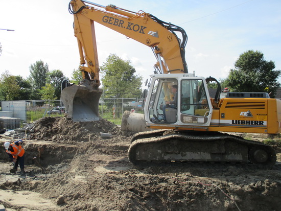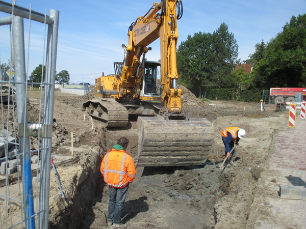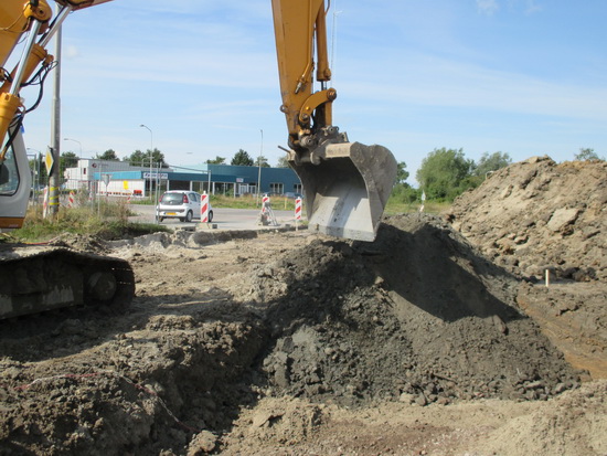 Aan de westkant van de ‘noodweg’ (die de hele volgende week is afgesloten voor alle verkeer!) is een kraanmachinist van de Gebr. Kok bezig op aanwijzing van een witte-helmdrager grond te verwijderen, laagje voor laagje, heel behoedzaam. Op zoek naar een leiding? Of liggen hier onvermoede schatten verborgen??!