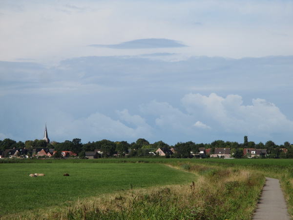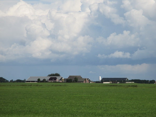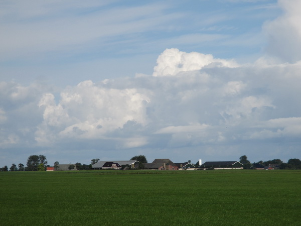 Vanaf het beton pad de uitdijende onderneming van de familie Stigter, met prachtige wolkenlucht!