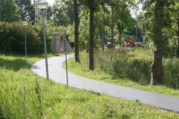 Eindelijk een verbeterd fietspad, degelijk geasfalteerd overdag, hier in avondrust. Nog niet in gebruik, zie het lint. Het lint zal wel zijn weggehaald inmiddels…