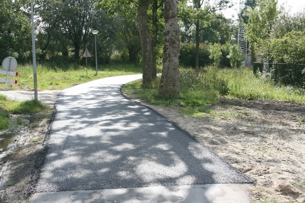 Het vernieuwde gedeelte van de Mokkenburgweg dat in het afgelopen jaar ook veel te lijden heeft gehad onder diverse ingrepen. Nu ligt er een fraaie laag asfalt! De weg kon eigenlijk direct worden gebruikt. Ander soort asfalt?