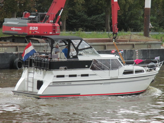 Mooi bootje! Neerlandse vlag achterop, voorop een Fries vlaggetje, ik zie ook nog een Groninger vlag….