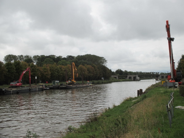 Kanaaloverzicht richting spoorbrug. Het rood links is van het bedrijf dat matten met keien gebruikt als oeverversteviging. Verderop het geel-oranje van STERK, de specialisten in heiwerk. Rechts aan de Noordhornkant het echte oranje van Mechielsen voor het betere graafwerk….