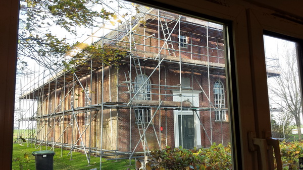 Zoals in Klein Wetzinge, middenin een agrarisch gebied. Dat kan in het gebruik van het gerestaureerde gebouw een belangrijke rol gaan spelen. Denk maar aan Visvliet, waar de kerk “de mooiste kamer van het dorp” is! Of neem Garnwerd, waar vaak een ‘avondmaal’ wordt georganiseerd, voor het dorp.”Kerk in Klein Wetsinge, in de steigers, vanuit Jur Bekooys bouwkeet- Jur is stellig: “Een kerkgebouw is net een lichaam, het moet levend blijven, het bloed moet blijven stromen! Bewegen, net als mensen!” Nog zo’n voorbeeld: Den Horn! “Zag er eerst niet goed uit. Nu leeft het, dankzij een actieve groep mensen!”