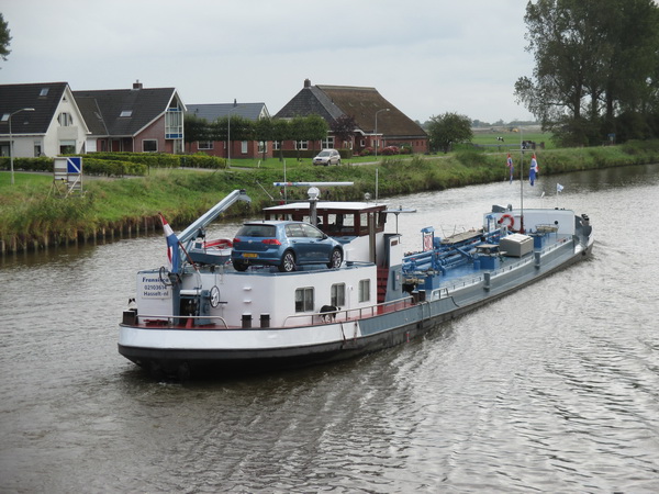 Foto die ik 10 september maakte vanaf de Zuidhornkant bij de brug, toen ik even moest wachten. Niet alleen grote boten, ook kleienere, zoals deze “Fransisca”, ruim 1000 ton, als ik het goed heb onthouden… (Of zat die er net onder???!)