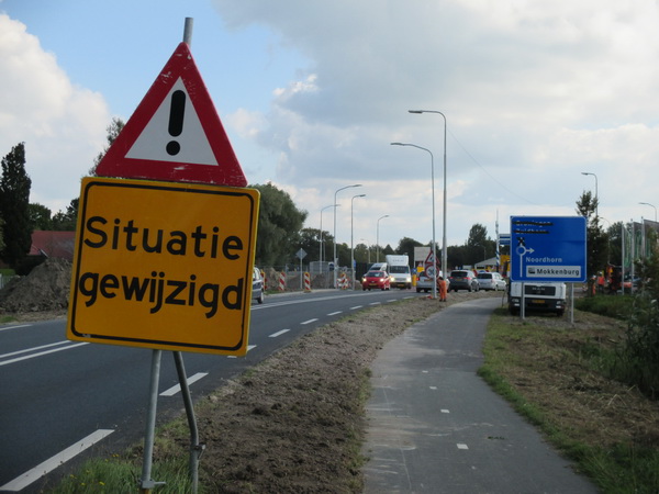 Links een befaamd bord intussen, met een tekst die waarschuwend is, maar ook verwarrend…. In ieder geval: PAS OP! Rechts al een nieuw blauw bord met nog enkele afplakkingen. Op de achtergrond wordt o.a. gewerkt aan het plaatsen van lantarenpalen, nou ja, lichtmasten…
