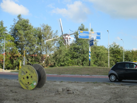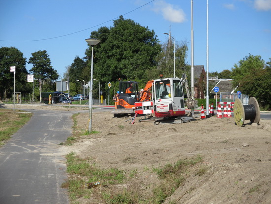 De grote, nieuwe handwijzer staat inmiddels keurig recht op de gemaaide bult van de rotonde. De haspel zal te maken hebben met de bekabeling van de lichtmasten, erg laat gepland in het rooster van werkzaamheden,,,