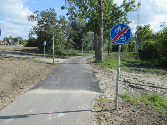 Langzamerhand zijn/worden ook de definitieve verkeersborden geplaatst. Hier bij de Mokkenburgweg Noord met links de aftakking (fietspad!) naar de Industrieweg. Waarom het eerste stukje Mokkenburgweg fietspad is, vanaf deze plek dan ineens niet meer? Dat heeft waarschijnlijk te maken met de bestemming van de lege plek die Mokkenburgweg 1 heeft achtergelaten…