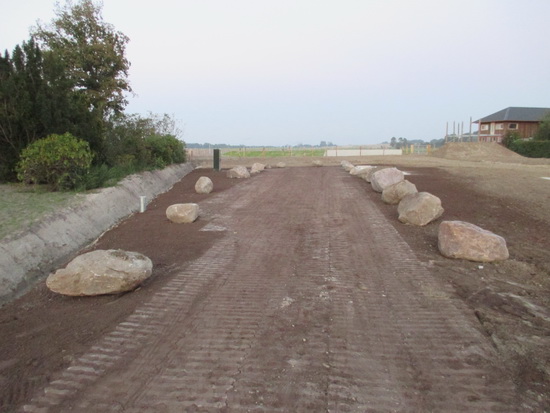 De verharde oprit naar de pompkelder op het tunnelterrein oost. Er zijn forse veldkeien ter decoratie neergevlijd aan de randen van het toegangspad; bovendien rij je dan niet zo gemakkelijk buiten de entree….