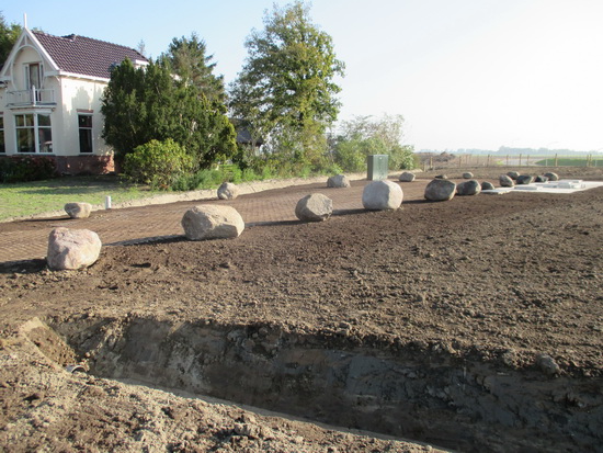 Er zijn toch heel wat veldkeien opgedolven, mooi teruggegeven aan het gebied… Nee, hier komt geen wandelpad met zitbank. Wel gras, beplanting aan de randen, een enkele boom…
