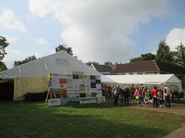 De grote tent van de befaamde rommelmarkt, achter het verenigingsgebouw “De Wegwijzer” (van de Hervormde Gemeente Noordhorn). Met sponsorborden en partytent… Optimale weersomstandigheden, een drukte van belang met aan het eind van de dag vast tevreden gezichten…