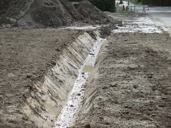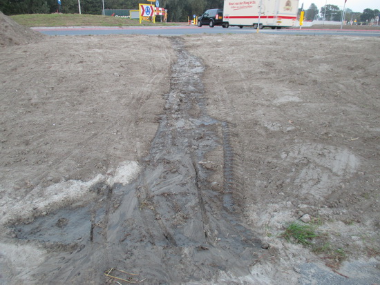 Nog even de noord-zuid lopende afwateringsgreppel tussen ‘noodweg’ en tunnelterrein oost… In tegenlicht… Nee, hier zal geen schoonheidsprijs aan worden toegekend!