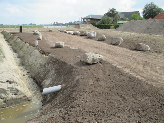 Op de voorgrond de noodzakelijke afwateringsgreppel, geen esthetisch hoogtepunt… Verderop de entree richting de pompkelder, opgetuigd met veldkeien. (Toch nog zitplaatsen dus…)