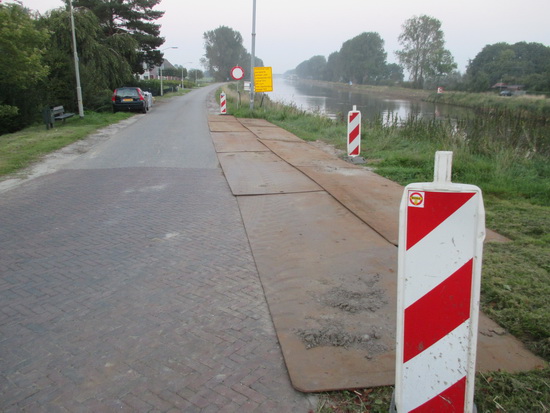 En opnieuw liggen er rijplaten langs het begin van de Kanaalweg (oost), bij de hoek met de brug. Eerder ook al, maar die werden opgeruimd… Er wordt blijkbaar toch nog meer zwaar verkeer verwacht….