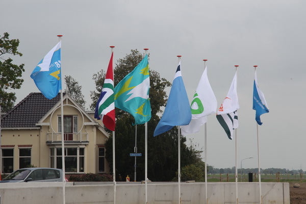 Nu wel volop vlagvertoon in de bovenwereld met o.a. het dundoek van de Provincie Groningen, dat gisteren nog ontbrak. Daar beneden, IN DE TUNNELBAK, zal de officiële opening plaatsvinden, vanaf 14.30 uur.