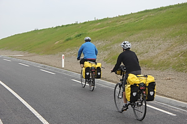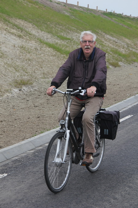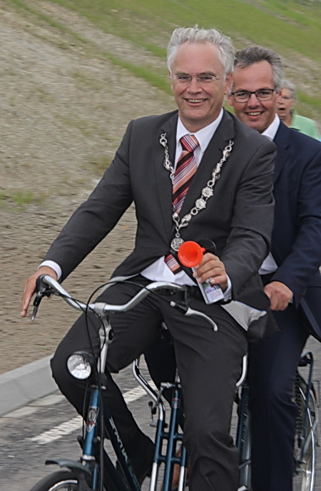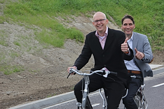 Dit vind ik pas echt leuk (om in Facebooktermen te blijven…) Twee, naar mijn inschatting, buitenlandse fietstoeristen die van de gelegenheid gebruik maken om het nieuwe tracé in te rijden. Als ze nou bij de aansluiting op de oude N355 maar niet op de rijbaan voor snelverkeer blijven rijden….