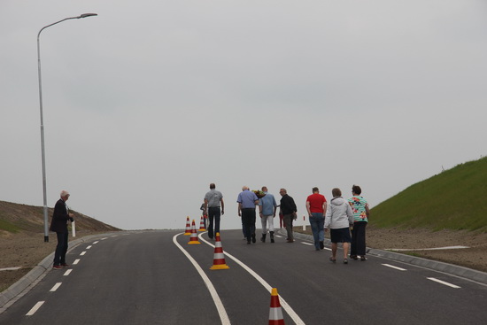 Kijk eens, de gelukkigste man van Noordhorn (bij benadering…) loopt met zijn fanclub van tunnel tot nieuwe brug en terug… Of van tunnel tot veetunnel van Holtman, ik weet niet hoe het met de benen van dit gezelschap is gesteld… Nee, er hoort geen geluid bij van “De paden op, de lanen in, vooruit, met flinke pas…” Links staat Johan Vergonet (van Welkom in Zuidhorn), hij vergist zich. Dit hier is Zuidhorn nog niet….