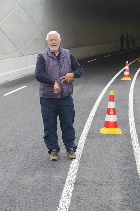 Ja, hij is er toch! Wegverleggingswatcher en Midhorncorrespondent van het eerste uur: Jan Thijs de Haan! Met een veelzeggend gebaar uit hij zijn misnoegen over de naamgeving van de tunnel: “Dat kan toch niet! Komt er bezoek naar of door Noordhorn, zien ze dat ze in “Gulphorn” zijn, dat kan toch niet…!”