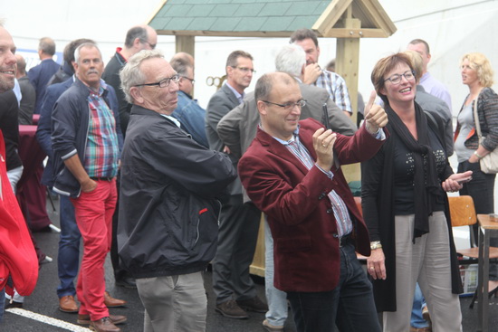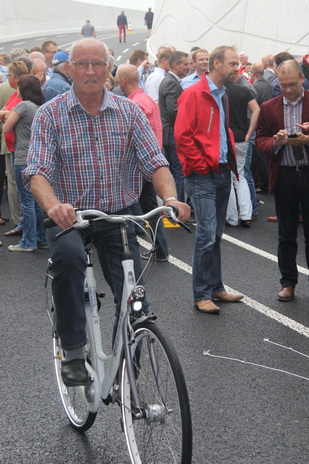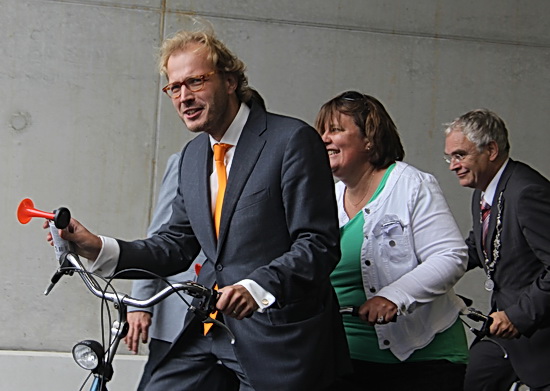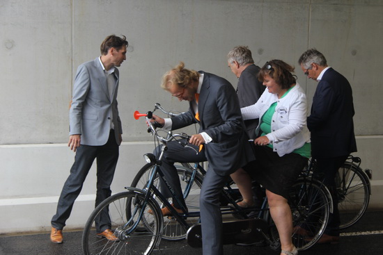 Actie! De vier speechers bij de opening worden dringend verzocht op twee tandems plaats te nemen. De Gedeputeerde Mark Boumans krijgt Els van Grol (Directeur Rijkswaterstaat) als fietspartner, burgemeester Bert Swart wordt bijgetrapt door GMB-directeur Van de Pol. Let ook op het voorwerp in Boumans’ rechterhand…. (Binnen de kortste keren was het blaasvoorwerp naar zijn mallemoer….)