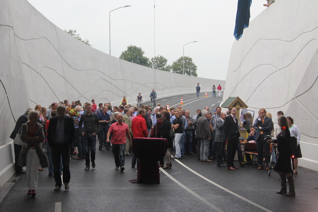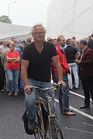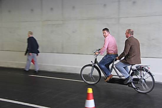 Er staan meer fietsen klaar, zelfs nog een tandem, beschikbaar gesteld door Rijwielhuis Kuis, bijna ook een buur van de tunnel. Peter Melis en Bernard van Noordenburg, van het GMB-managementteam, willen niet achterblijven en trachten ietwat geforceerd de Gluphörnopeners (Het lijkt wel een carnavalsvereniging…) te achterhalen.