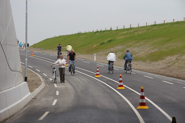 Het fietsen door de tunnel richting de NVH-brug, en terug, komt op gang! Links Midhorner en bouwinsider Anne Tillema, rechts Langestraatbewoner Jaap Helmus, beiden niet bepaald voorstanders van het gerealiseerde project, maar sportief genoeg om op een geleende fiets door de tunnel te jakkeren…