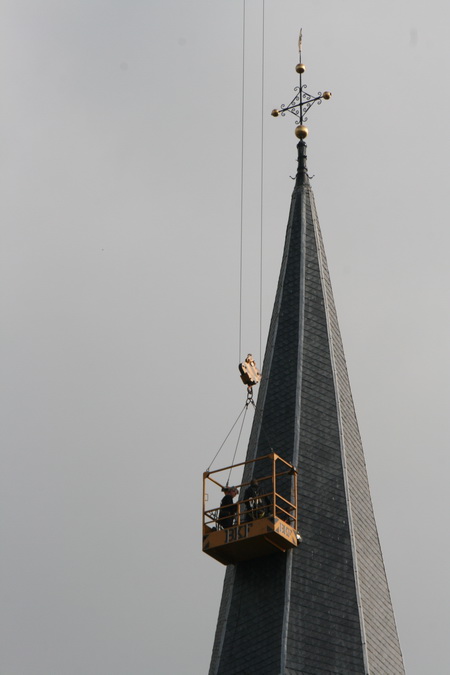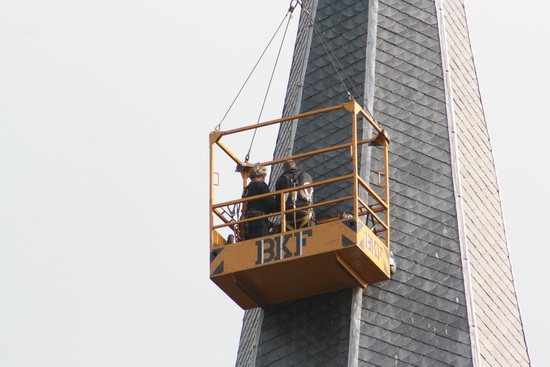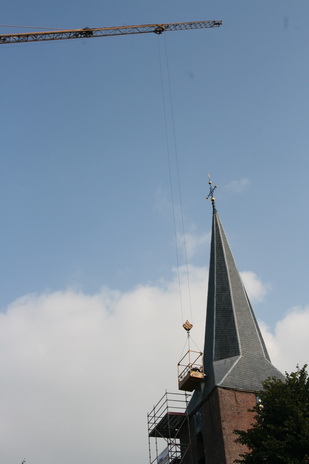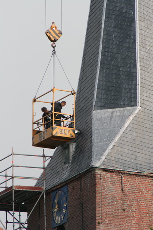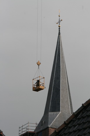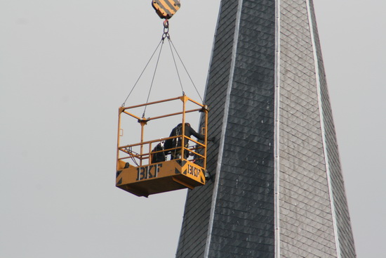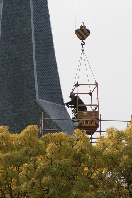 Boven de kruinen van de verkleurende loofbomen is aan de westzijde van de toren het “manbakje” van BKF goed zichtbaar. Het ‘vliegend personeel’ is al bezig met de bliksemafleiders, de reparatie van het dakdeel is afgerond.