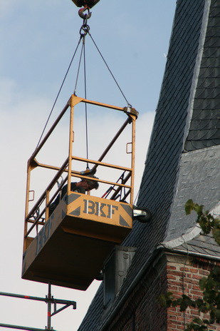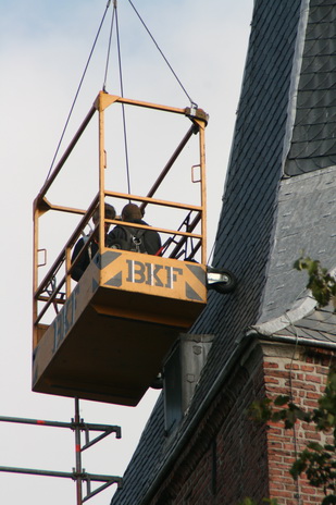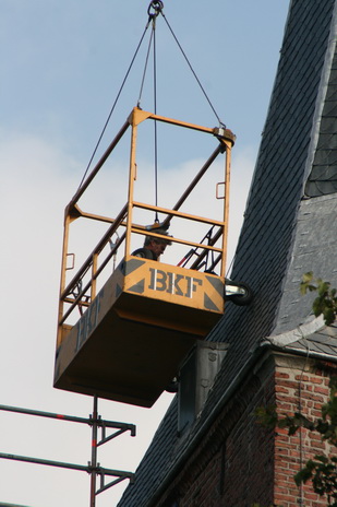 Ja, twee medewerkers in het bakje dat door de kraanmachinist keurig op zijn plaats wordt gehouden. De hoge steigers? Die worden binnenkort weer afgebroken door de ‘klauteraars’ van Gjaltema.