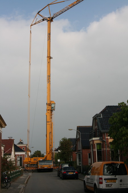 De indrukwekkende aanwezigheid van de enorme hijskraan midden in de Langestraat. Daar is zo’n KBF-bedrijfsauto maar een autootje bij…..