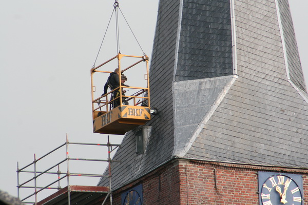De technici (in veiligheidsgordels) zoeken het hogerop….