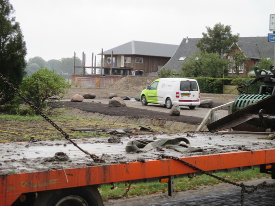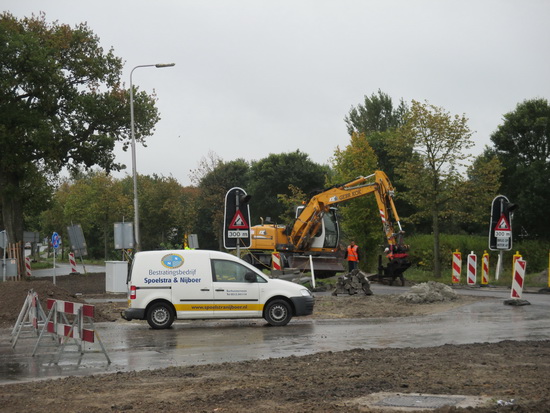 Spoelstra & Nijboer heet het bestratingsbedrijf dat als onderaannemer is ingeschakeld bij de reconstructie van dit kruispunt. Er worden betonplaten verwijderd uit de oude N355, daar zal waarschijnlijk ook worden geasfalteerd komende zondag.