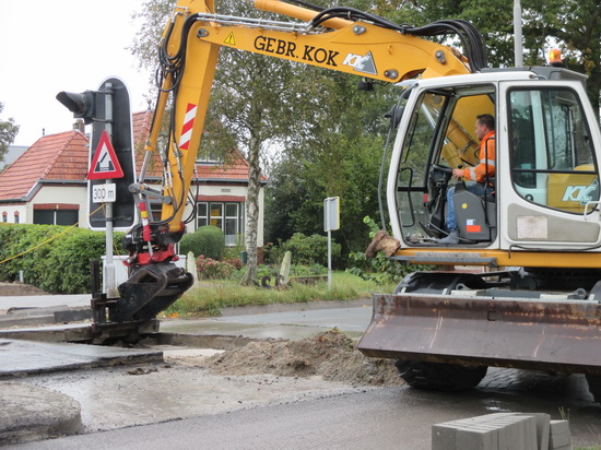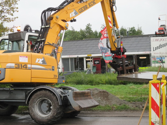 Er wordt een kraan gebruikt van de Gebr. Kok, ervaren wegverleggers en -verbeteraars.