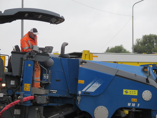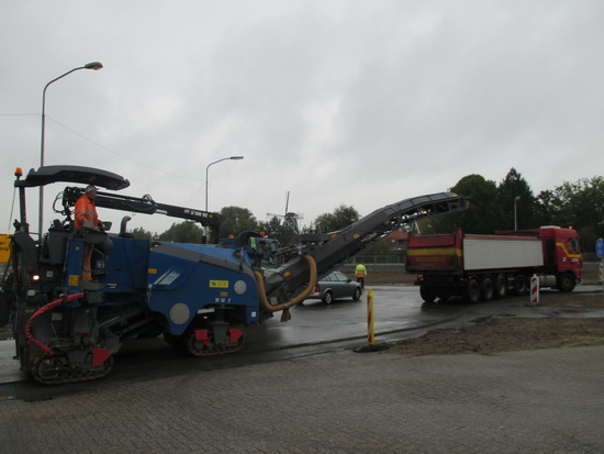 Aha, de ‘asfaltspuwer’ is ook paraat. Er wordt ‘oud asfalt’ vermalen en in de laadbak van de Zwama-auto geblazen…